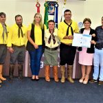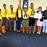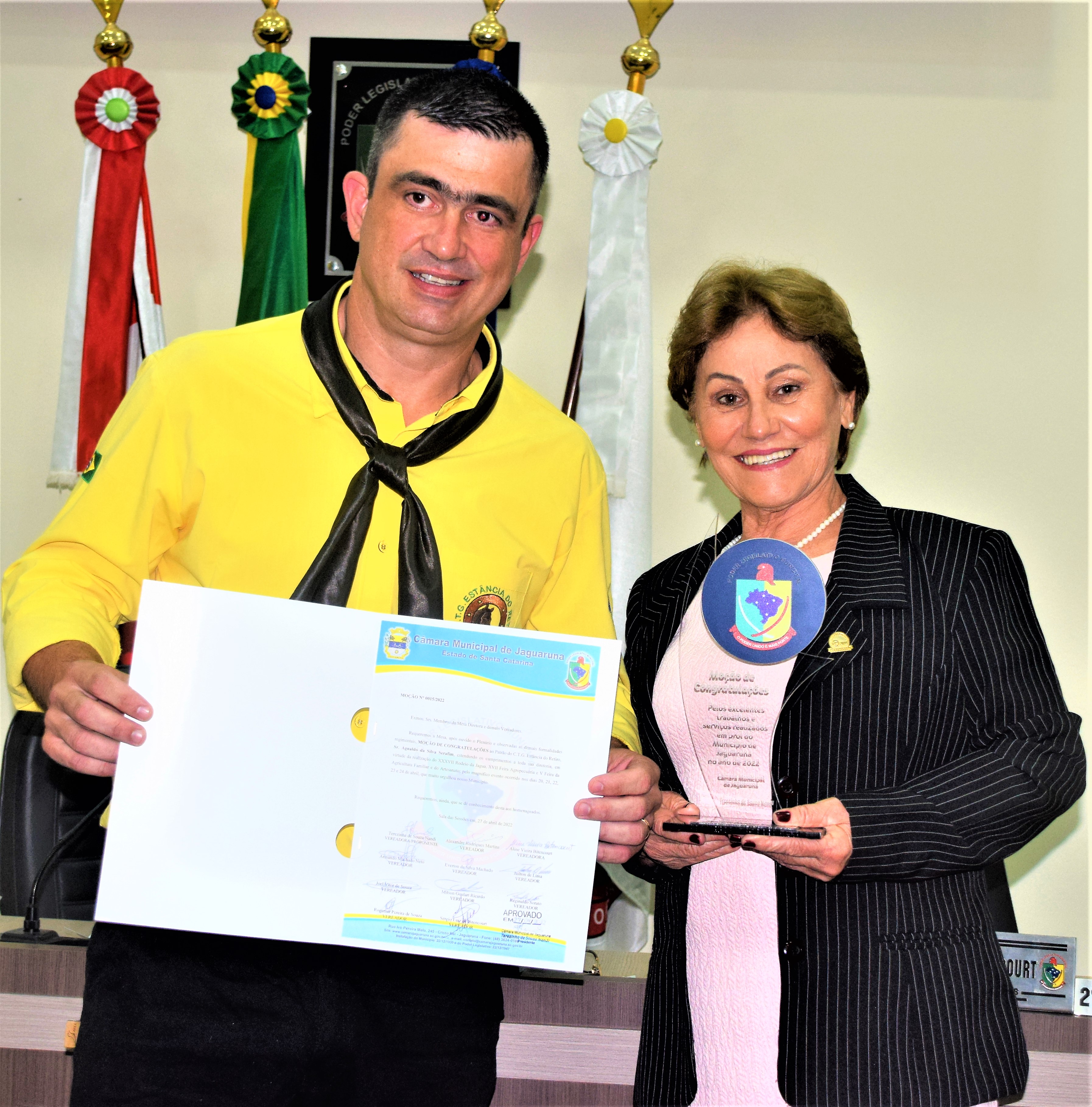Sob a proponência da Vereadora Terezinha de Souza Nandi atual Presidente do Legislativo Jaguarunense, através da moção de congratulações Nº 015/2022, moção ao Patrão do CTG Estância do Retiro Médico Veterinário Agnaldo Serafim juntamente com a Patroa Vanessa Serafim e toda sua patronagem ,merecidíssima homenagem pela passagem do XXXVII Rodeio crioulo Interestadual da Jagua ,juntamente com a XVII Feira Agropecuária e V Feira da Agricultura Familiar e do do Artesanato realizado nos últimos dias 20-21-22-23 e 24 de abril no CTG Estância do Retiro em Jaguaruna, pelo magnífico evento que muito orgulhou a população Jaguarunense pós pandemia.