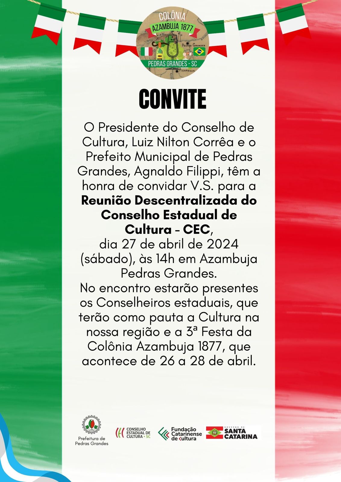 O Conselho Estadual de Cultura (CEC) se reúne neste sábado, 27, às 14 horas, em Pedras Grandes, por ocasião da 3ª Festa da Colônia Azambuja 1877. Na reunião descentralizada será aberta a palavra aos órgãos municipais de cultura e representantes da sociedade civil a fim de apresentar as demandas municipais na área da cultura.