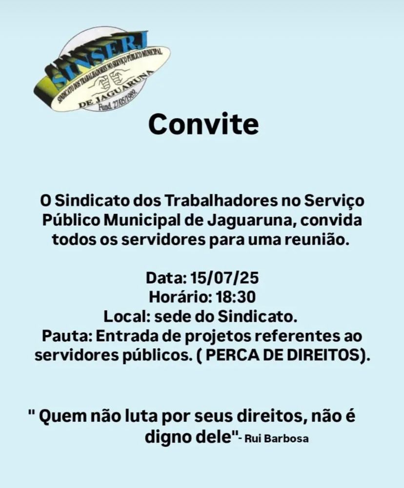 O sinserj-Sindicato dos Trabalhadores no Serviço Público de Jaguaruna ,atravé da sua Presidente Adriana Cardoso ,convida a todos os associados para uma importante reunião no pçróximo dia 15 de Julho de 2025 as 18:30 na sede do Sindicato.
