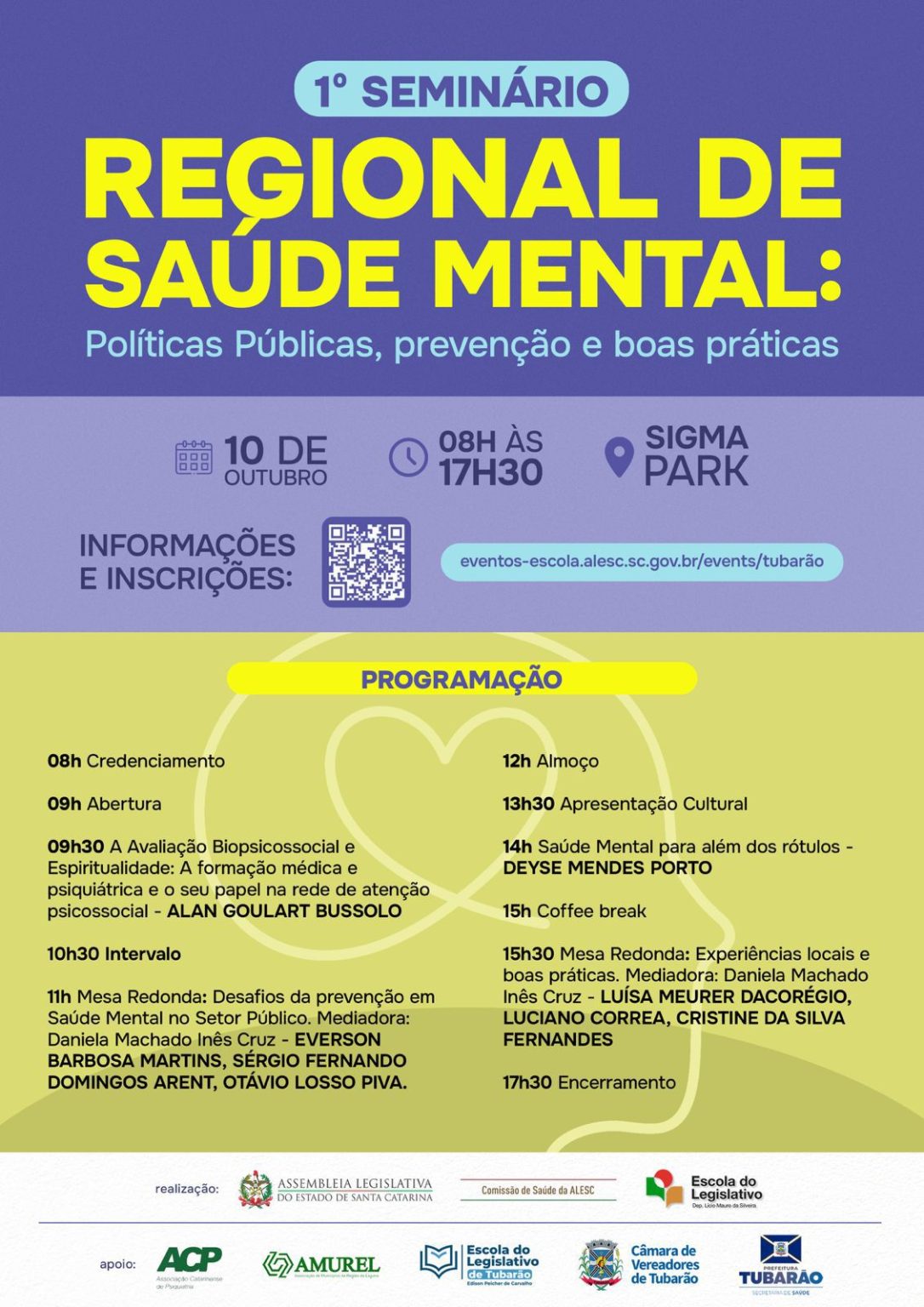 O evento é realizado em parceria com a Associação Catarinense de Psiquiatria (ACP), AMUREL, Escola do Legislativo de Tubarão, Câmara de Vereadores de Tubarão e Prefeitura Municipal de Tubarão.