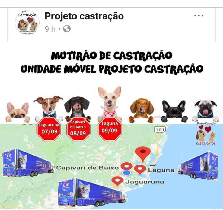 A Prefeitura Municipal de Jaguaruna ,em conjunto com a vigilância Sanitária e a Ong Olhar do Animal ,estarão proprocionando no dia 07 de setembro feriado nacional ,um mutirão de castração de cães e gatos. Estara chegando em Jaguaruna uma carreta com uma equipe de veterinários com todo aparato que proporcionará as pessoas que desejam castrar seus animais um trabalho diferenciado e de qualidade que será oferecido por esta equipe.Esta equipe além de \Jaguaruna estará realizando este mutirão em diversos outros municipíos da região.