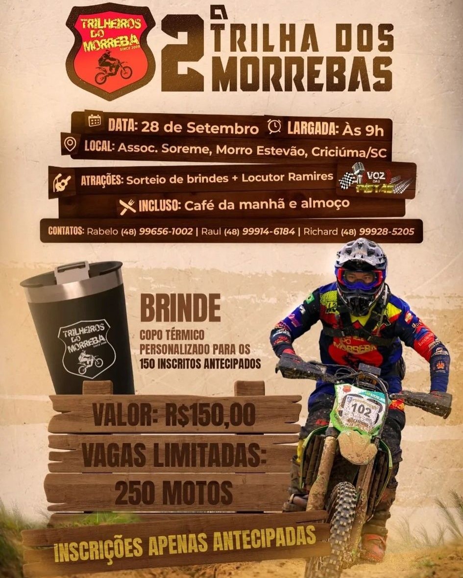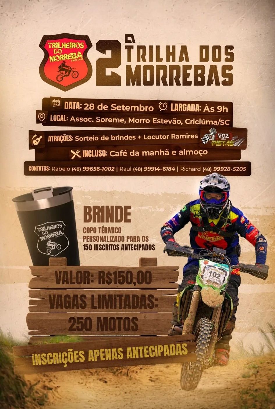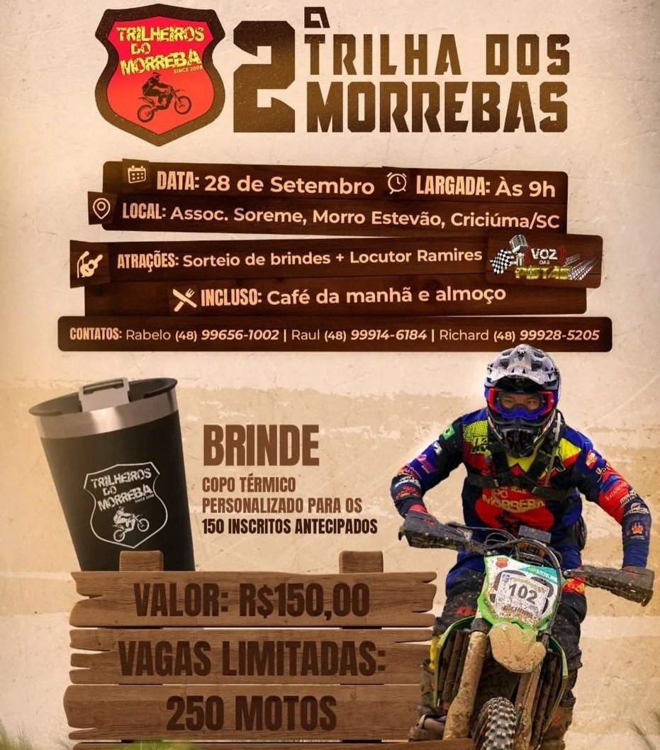 Vem aí dia 28 de Setembro segunda Trilha dos Morrebas dia 28 de setembro de 2025 as 9:00 da manhã na Associação Soreme Morro Estevão em Criciuma confira a programação completa no banner.