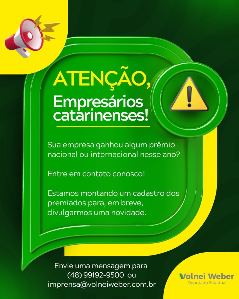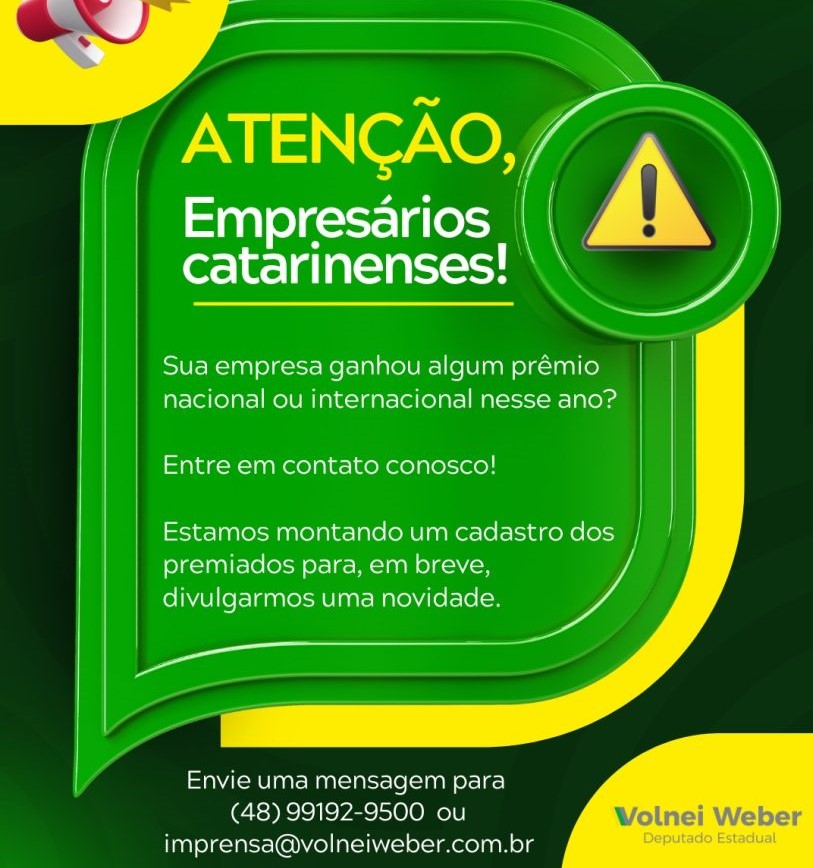 O deputado estadual Volnei Weber está convocando todos os empresários catarinenses cujas empresas receberam prêmios nacionais ou internacionais em 2025 para participarem de um cadastro especial que está sendo organizado pelo seu gabinete.