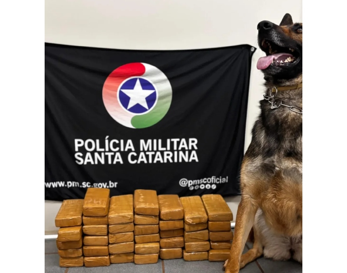 Com o auxílio do cão farejador, foi encontrada uma mala contendo 37 tabletes de maconha, totalizando 20,10 kg do entorpecente.