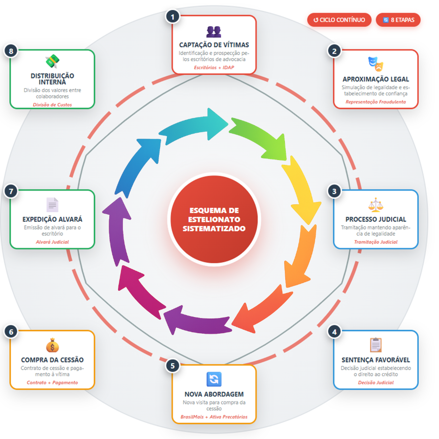 3 – Cessão fraudulenta: em um momento estratégico do processo, as vítimas eram persuadidas/induzidas a erro, a fim de que assinassem contratos de cessão de crédito com as empresas do núcleo empresarial, recebendo em troca valores ínfimos e desproporcionais ao valor real do crédito.