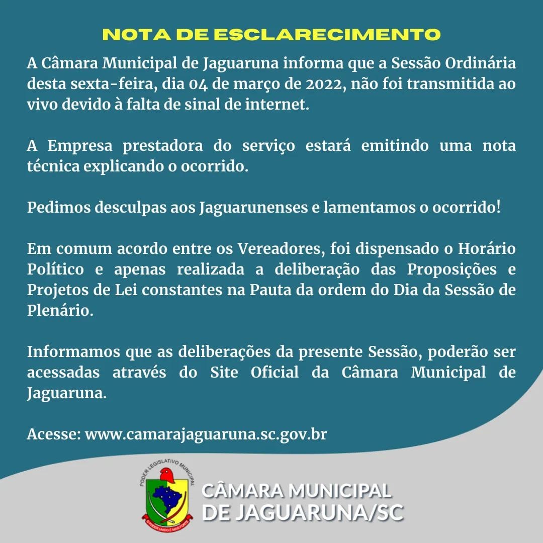 04março Nota de Esclarecimento Câmara de Vereadores de Jaguaruna Jaguaruna Nota de Esclarecimento Câmara de Vereadores de Jaguaruna Fonte: Câmara de Vereadores de Jaguaruna João Carlos Idalencio Autor