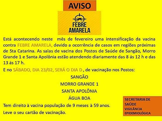 Acontecerá neste sábado dia 23 de fevereiro o dia D de vacinação contra a febre amarela em Sangão. Com o horário das 8hs até 12hs e 13hs até 17hs nos bairros Sangão, Morro Grande 1, Santa Apolônia e Água Boa. Pessoas que tem direito à vacinação são a população de 9 meses até aos 59 anos. Não esquecer a carteira de vacinação.