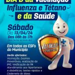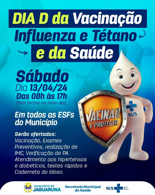 No próximo sábado, 13 de abril, das 08h às 17h, estaremos de portas abertas em todas as ESFs do município, sem fechar ao meio-dia! ??‍⚕️ Venha garantir sua proteção contra a Influenza (Gripe) e Tétano, além de cuidar da sua saúde de maneira completa! Ofereceremos vacinação, exames preventivos, verificação de IMC, pressão arterial, atendimento especializado para hipertensos e diabéticos, testes rápidos e ainda atualizaremos a caderneta do idoso. Não perca essa oportunidade de cuidar de você e de sua família! Estamos juntos por uma comunidade mais saudável.  #SaúdeJaguaruna #Vacinação #DiaDdaSaúde