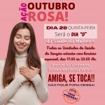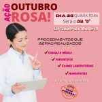 Trata-se da AÇÃO OUTUBRO ROSA que consistem em um atendimento com horário especial, em que as unidades de saúde do município estarão abertas entre as 17:00 às 20:00 horas. Neste dia serão promovidos vários procedimentos específicos, como consultas médicas, exames preventivos, mamografias e exames laboratoriais.
