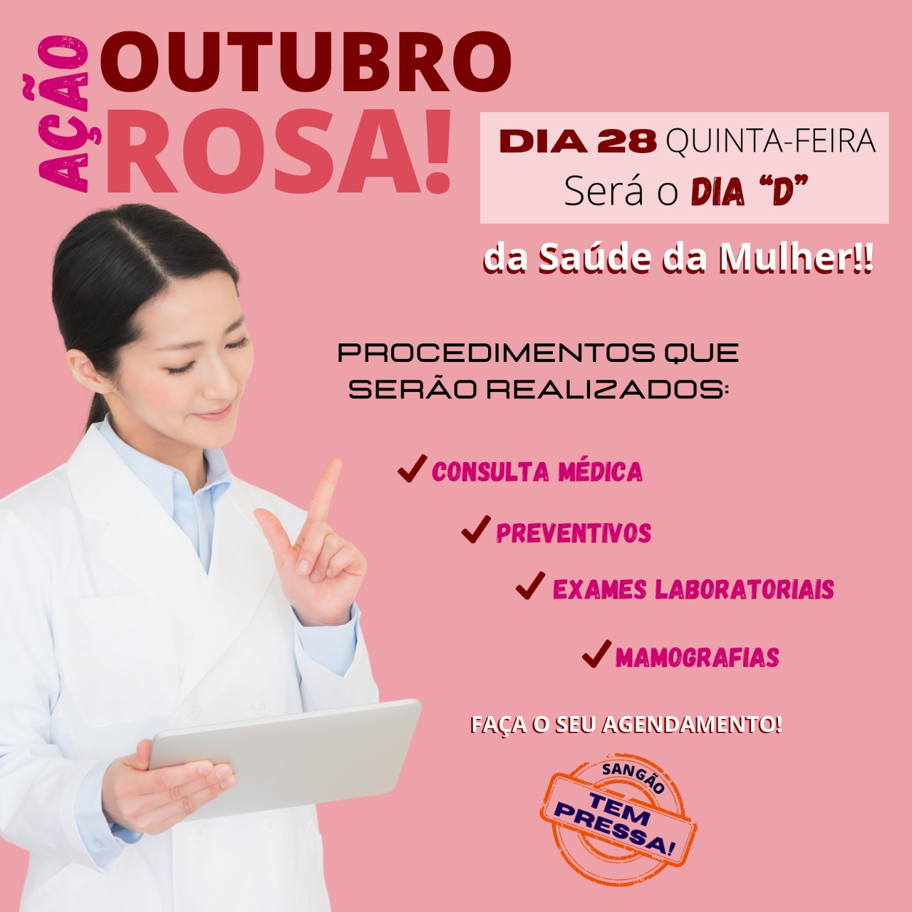 Sangão – A Secretaria de Saúde de Sangão programa para amanhã um dia especial de atendimento exclusivo para as mulheres, dentro das atividades planejadas para o Outubro Rosa, mês dedicado à prevenção das doenças que atingem as mulheres.