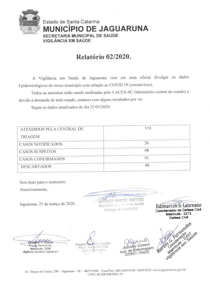 Muito embora alguns meios de comunicação estão divulgando que o município de Jaguaruna tenha dois casos não tivemos conhecimento de outra pessoa que tenha contraído o virus .Entramos em contato com o Lacem -po´rém não obtivemos uma resposta concreta haja visto que a pessoa que atendeu o telefone disse que não tem expediente no final de semana e que na segunda feira é feriado então que somente poderíamos receber alguma informação na próxima terça feira.