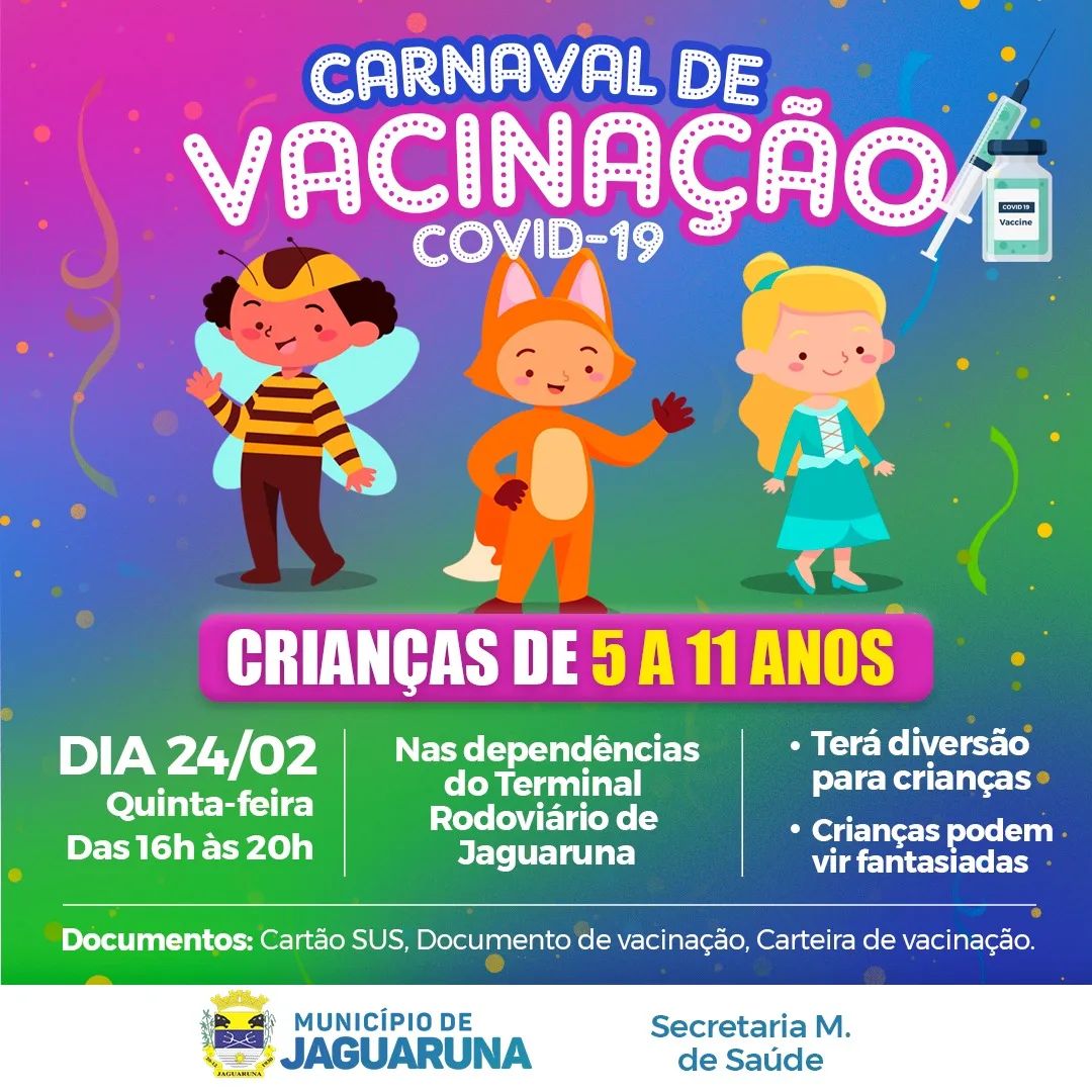 Jaguaruna-Vacinação Contra Covid-19 próxima quinta-feira (24) terá um dia de vacinação em crianças de 5 a 11 anos.