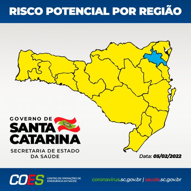 A Matriz de Risco Potencial Regionalizado divulgada neste sábado, dia 05, aponta 16 regiões classificadas como risco potencial alto (cor amarelo) e uma no nível de risco moderado (cor azul). Em um comparativo com o relatório divulgado na semana anterior, houve melhora nos indicadores da região do Vale do Itapocu, que na semana estava no nível de Risco Alto (amarelo), e passou a ser classificado no nível Moderado (azul).