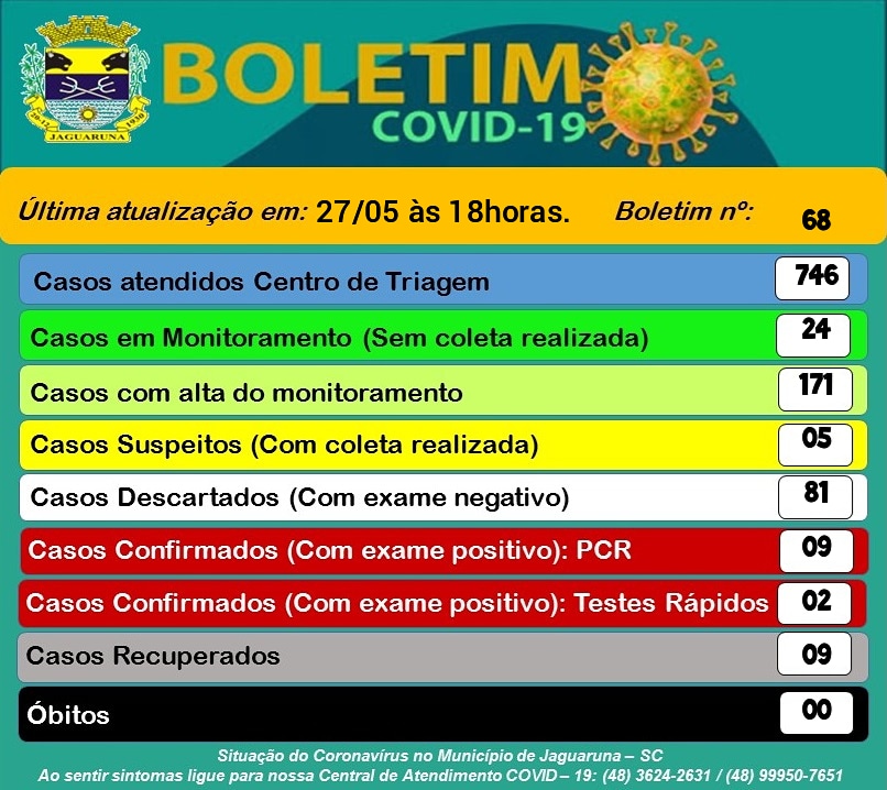 Secretaria Municipal de Saúde de Jaguaruna Atualiza Com Novo Boletim os Números do Corona Virus em Jaguaruna 27/05/2020 as 18:00 Boletim Nº 68