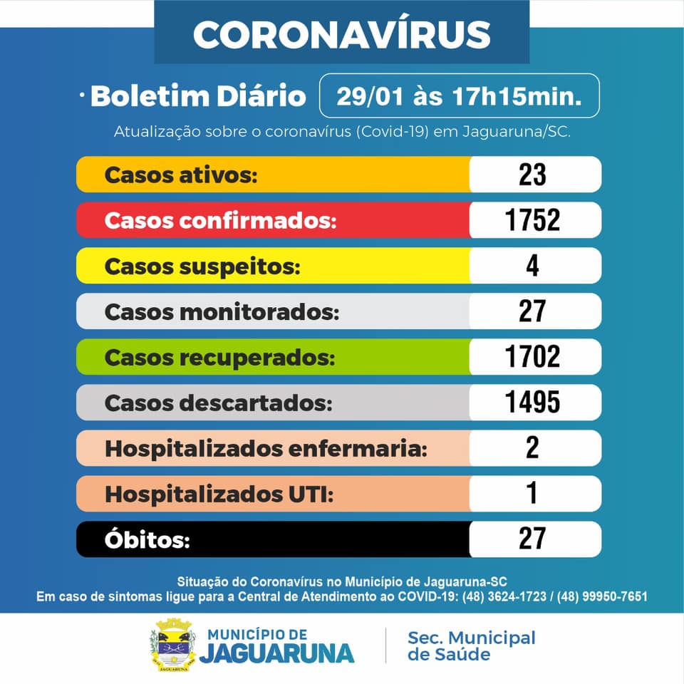 Secretaria Municipal de Saúde de Jaguaruna Atualiza os Números do Coronavirus deste dia 29/01/2021