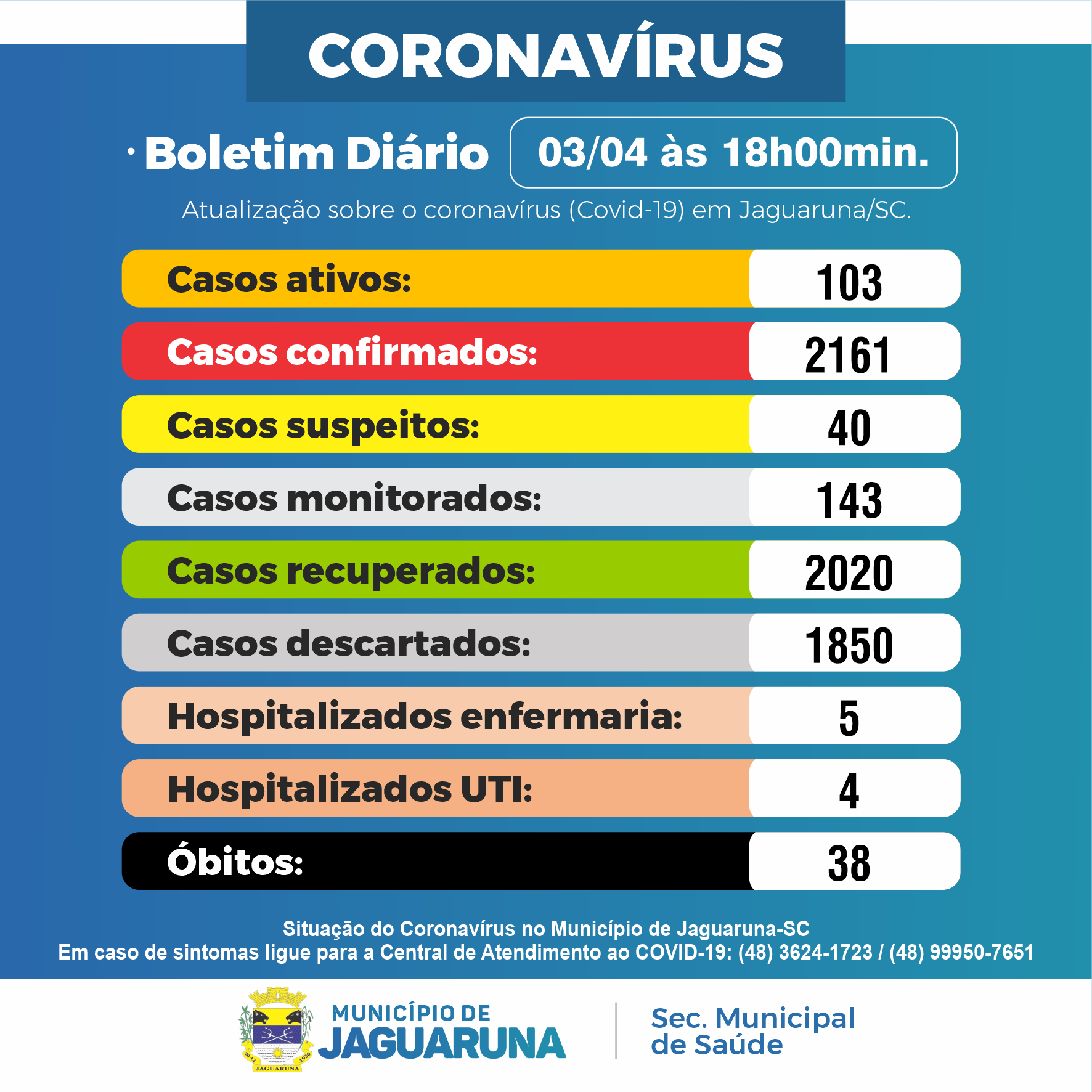 Secretaria Municipal de Saúde de Jaguaruna Atualiza os Números do Coronavirus em Jaguaruna com um aumento de 08 casos de sexta dia 02 para sábado neste dia 03 de abril de 2021.