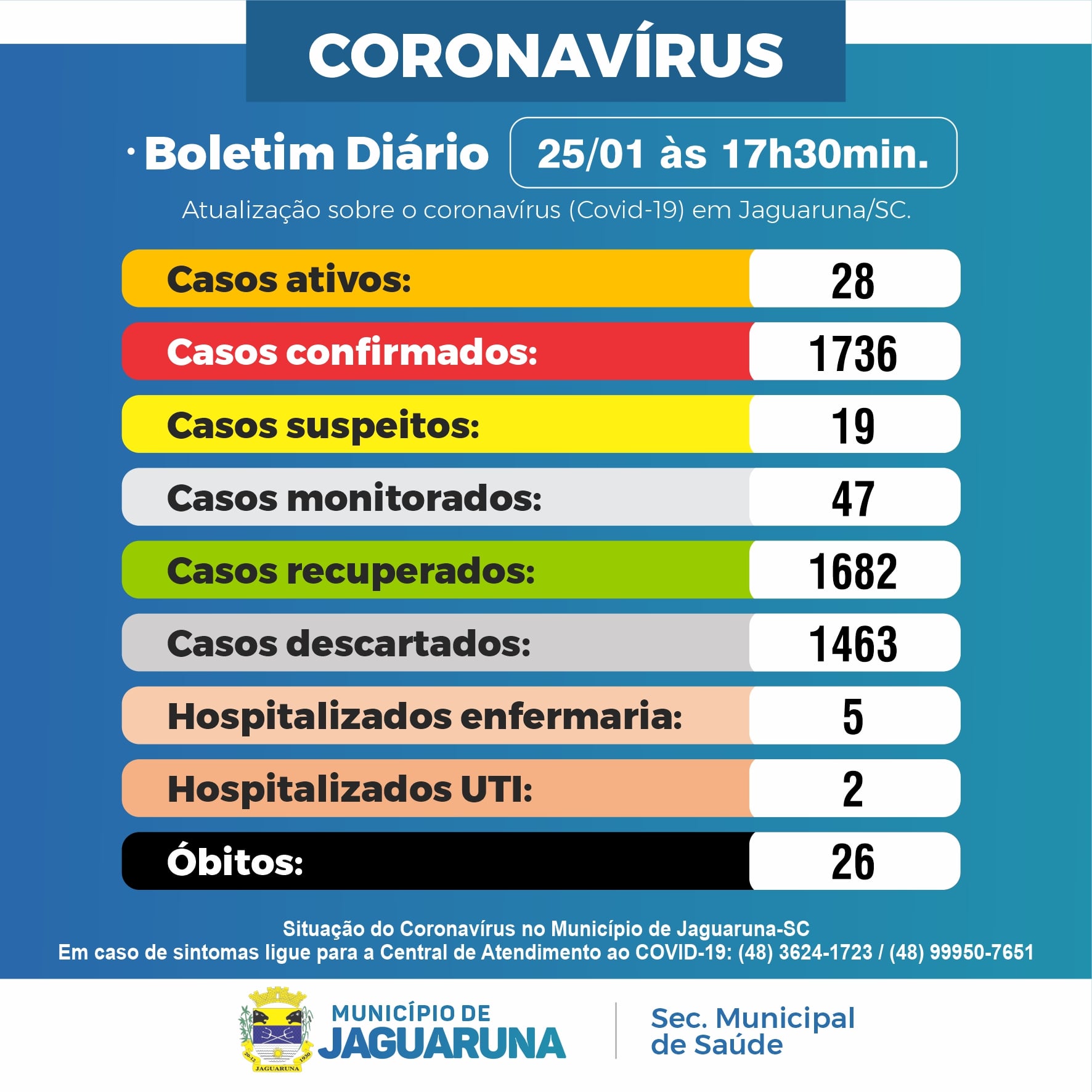 Secretaria Municipal de Saúde de Jaguaruna Atualiza os Números do Coronavirus Neste dia 25 de Janeiro 2021