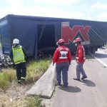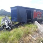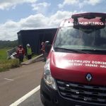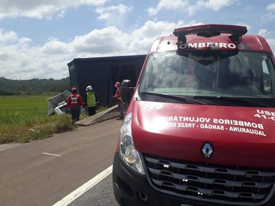 Os bombeiros Voluntários foram  acionados para atender uma saída de pista na BR 101 nas proximidades de Sangãozinho nesta tarde (07/03) por volta das 13:00h. Ao chegar no local a guarnição se deparou com uma carreta que transportava bobinas de aço. Segundo o condutor relatou que perdeu o controle do veículo colidindo com a mureta de proteção. Parte da carroceria ficou sobre a pista. Duas vítimas foram atendidas no local, um masculino de menor que segundo populares foi arremessado para fora do veículo e apresentava suspeita de fraturas na face, foi imobilizado em maca rígida e encaminhado pela viatura do Samu para o hospital HNSC de Tubarão, juntamente com seu pai, o condutor da carreta que apresentava apenas escoriações pelo corpo. PRF esteve presente no local dando apoio na sinalização da via.