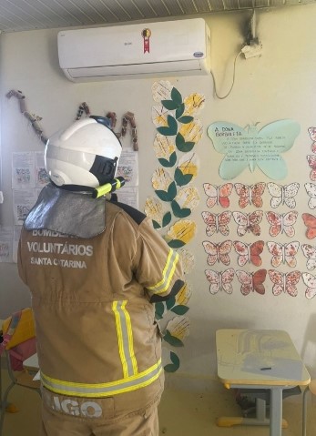 Os Bombeiros Voluntários foram acionados e verificaram que o incêndio teve origem elétrica, após curto circuito na fiação da tomada do ar condicionado em uma sala de aula.