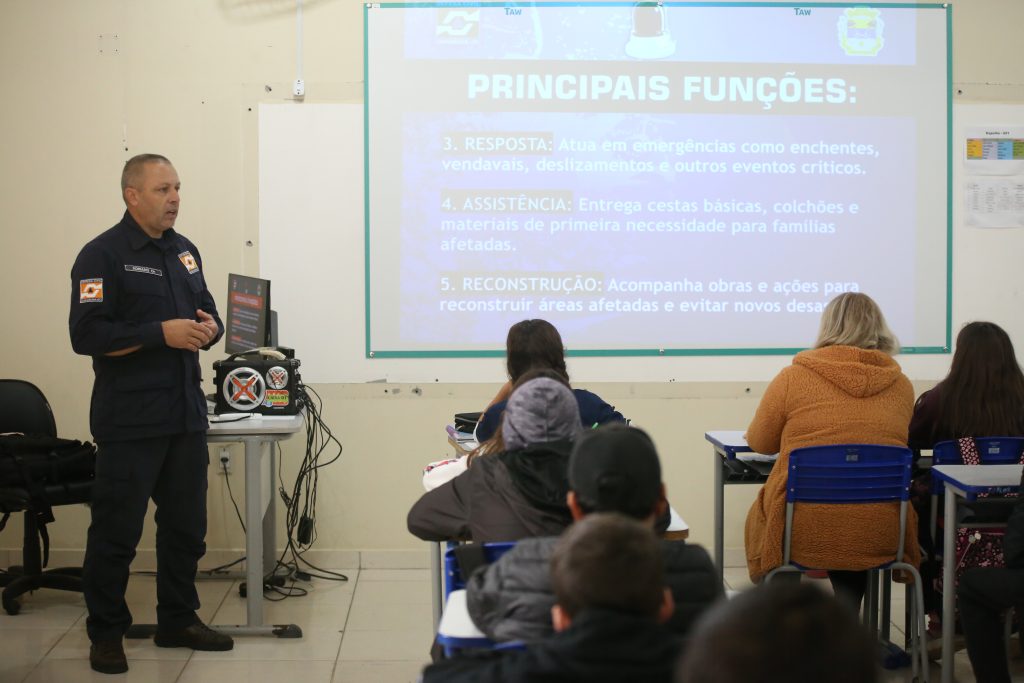 A Defesa Civil de Jaguaruna esteve presente na Escola de Educação Básica Campos Verdes nesta semana, promovendo uma importante ação educativa com os alunos do 6º ano. A iniciativa faz parte do programa “Defesa Civil nas Escolas”, que tem como objetivo conscientizar e preparar os estudantes para situações de risco e a importância da prevenção.
