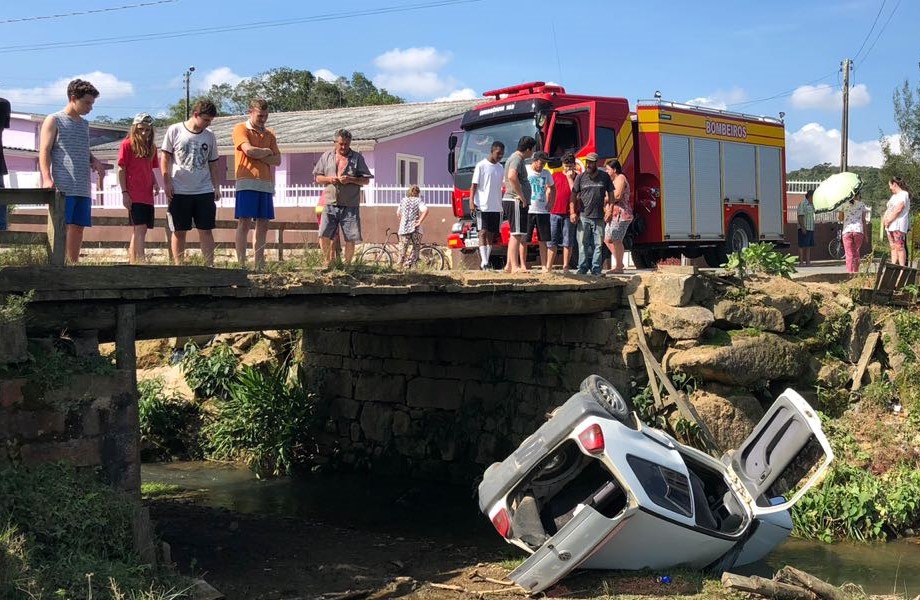 Na tarde dessa sexta-feira, um automóvel VW Gol caiu de uma ponte, no Bairro Rio Salto, em Urussanga. A motorista, de 23 anos, perdeu o controle do veículo em uma curva e saiu da pista. De acordo com a equipe de socorro, três pessoas estavam no carro no momento do acidente: a condutora e duas passageiras.