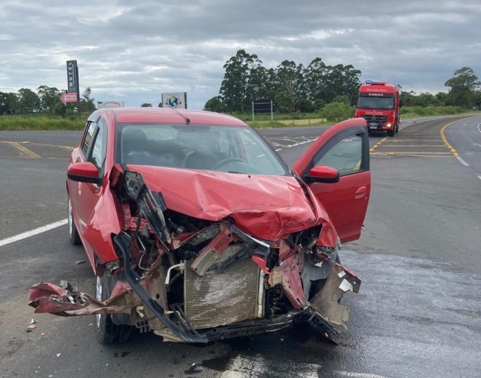 Os Bombeiros Voluntários foram acionados para atender o acidente envolvendo um veículo Ford Ka com placas de Araranguá e um Sandero com placas de Tubarão.