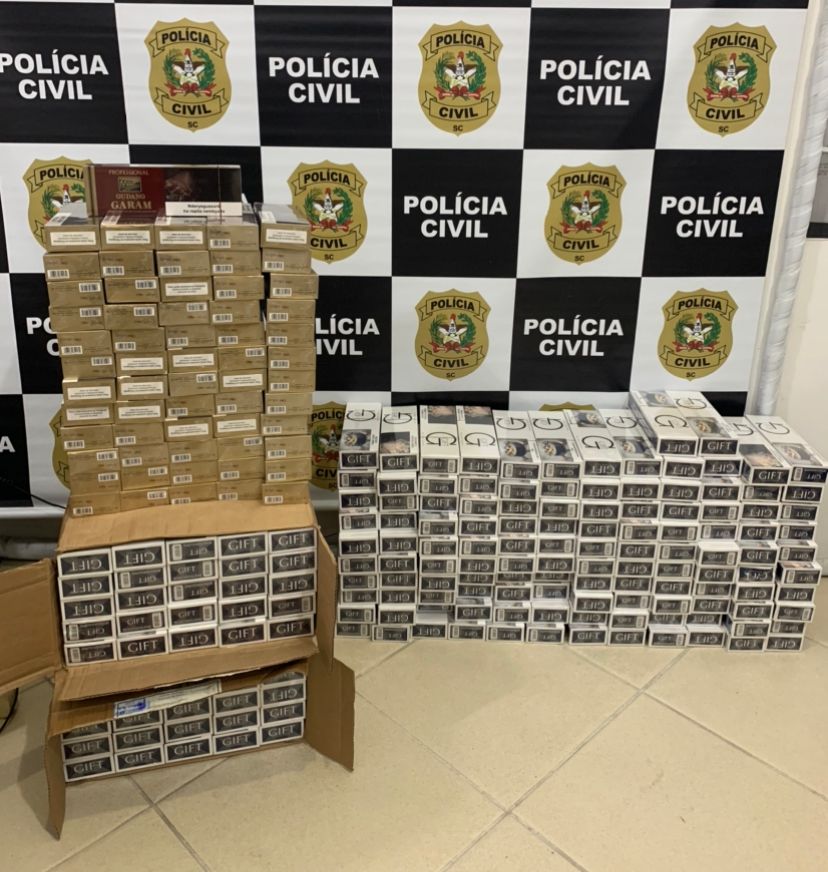 Na manhã de ontem, deu-se cumprimento aos mandados de busca e apreensão e durante as buscas na casa de um dos investigados a Polícia Civil apreendeu expressiva quantidade de cigarro contrabandeado e um dos veículos utilizados nos furtos ocorridos em Tubarão.