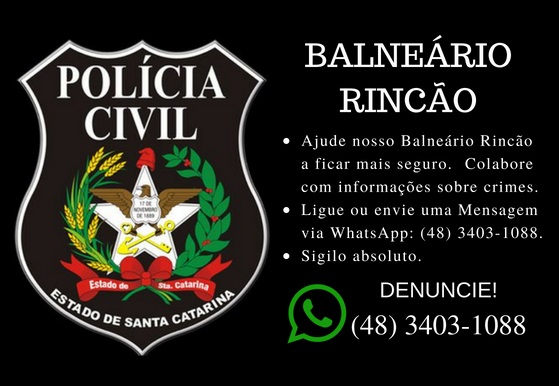 O número da Polícia Civil do Balneário Rincão passa a receber, a partir dessa semana, denúncias via WhatsApp. Informações podem ser repassadas ao contato (48) 3403-1088 que, apesar de ser um número fixo, tem acesso ao aplicativo em sua versão Business.