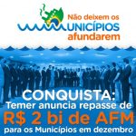 A Federação Catarinense de Municípios (Fecam) calculou quanto cada município catarinense deve receber do Aporte Financeiro aos Municípios (AFM), que soma R$ 2 bilhões para todo país. Cerca de R$ 78 milhões devem ser repassados pelo governo federal para as 295 administrações municipais de Santa Catarina. O repasse foi anunciado no dia 22 de novembro, durante audiência do presidente da República, Michel Temer, com líderes do movimento municipalista.